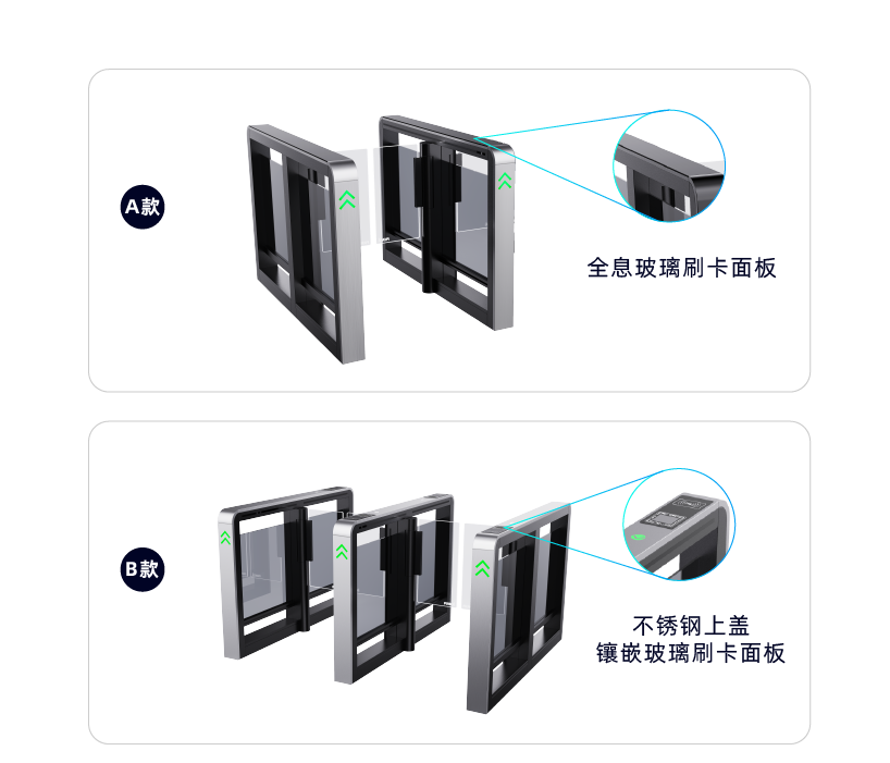 Z2689系列摆闸采用304不锈钢和冷轧板喷涂加工一体成型,根据刷卡面板材质不同,分A、B两款,A款为全息玻璃刷卡面板,B款为不锈钢上盖镶嵌玻璃刷卡面板。